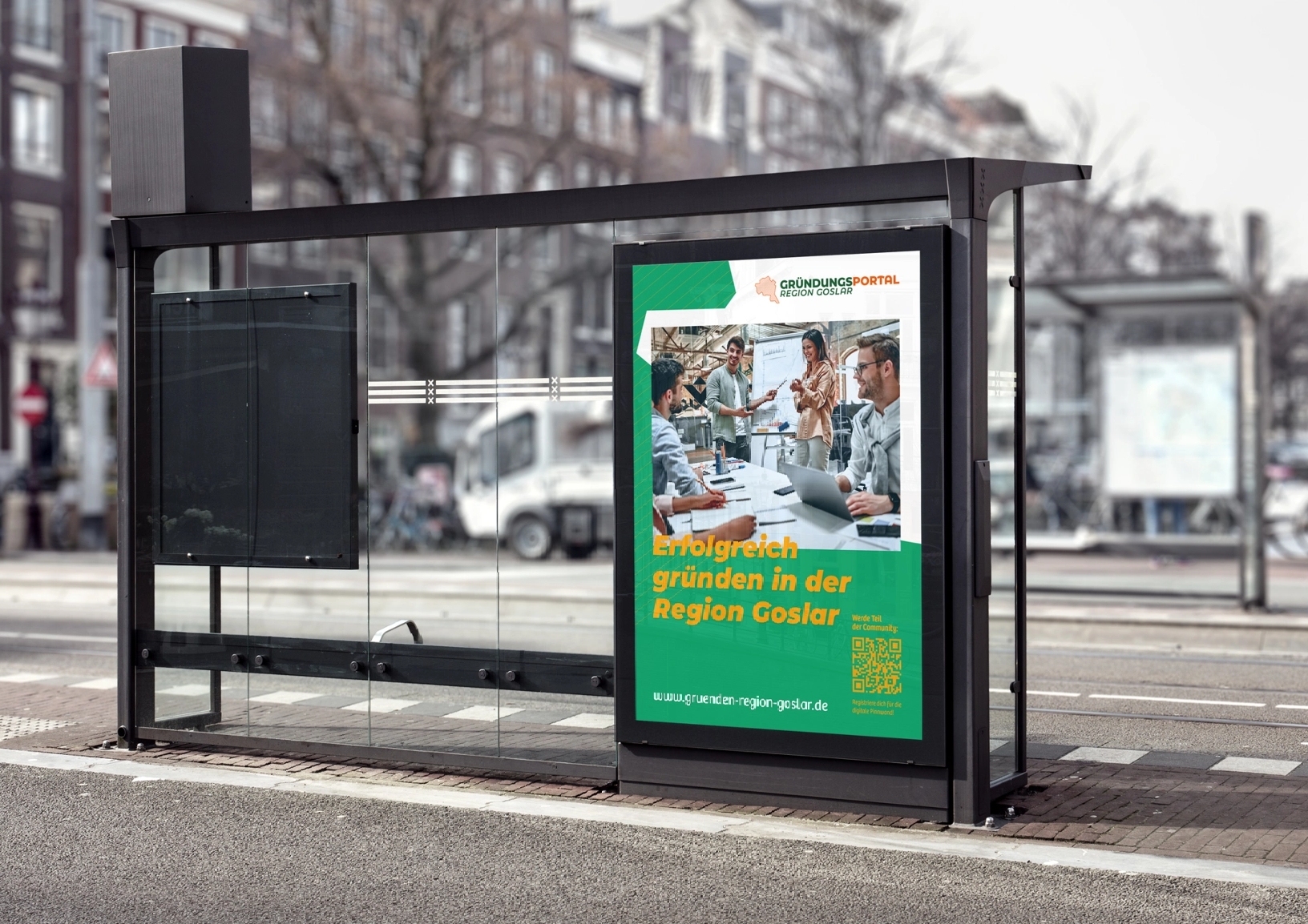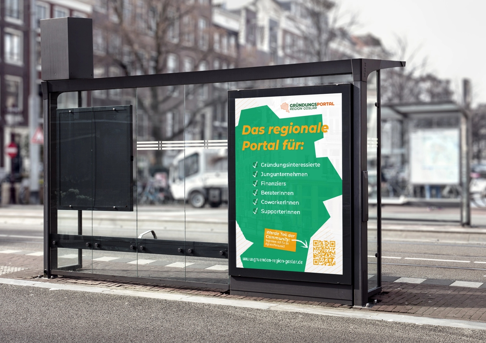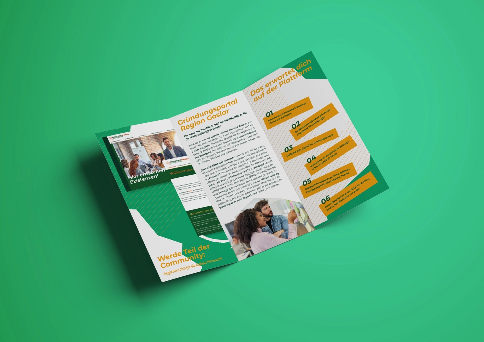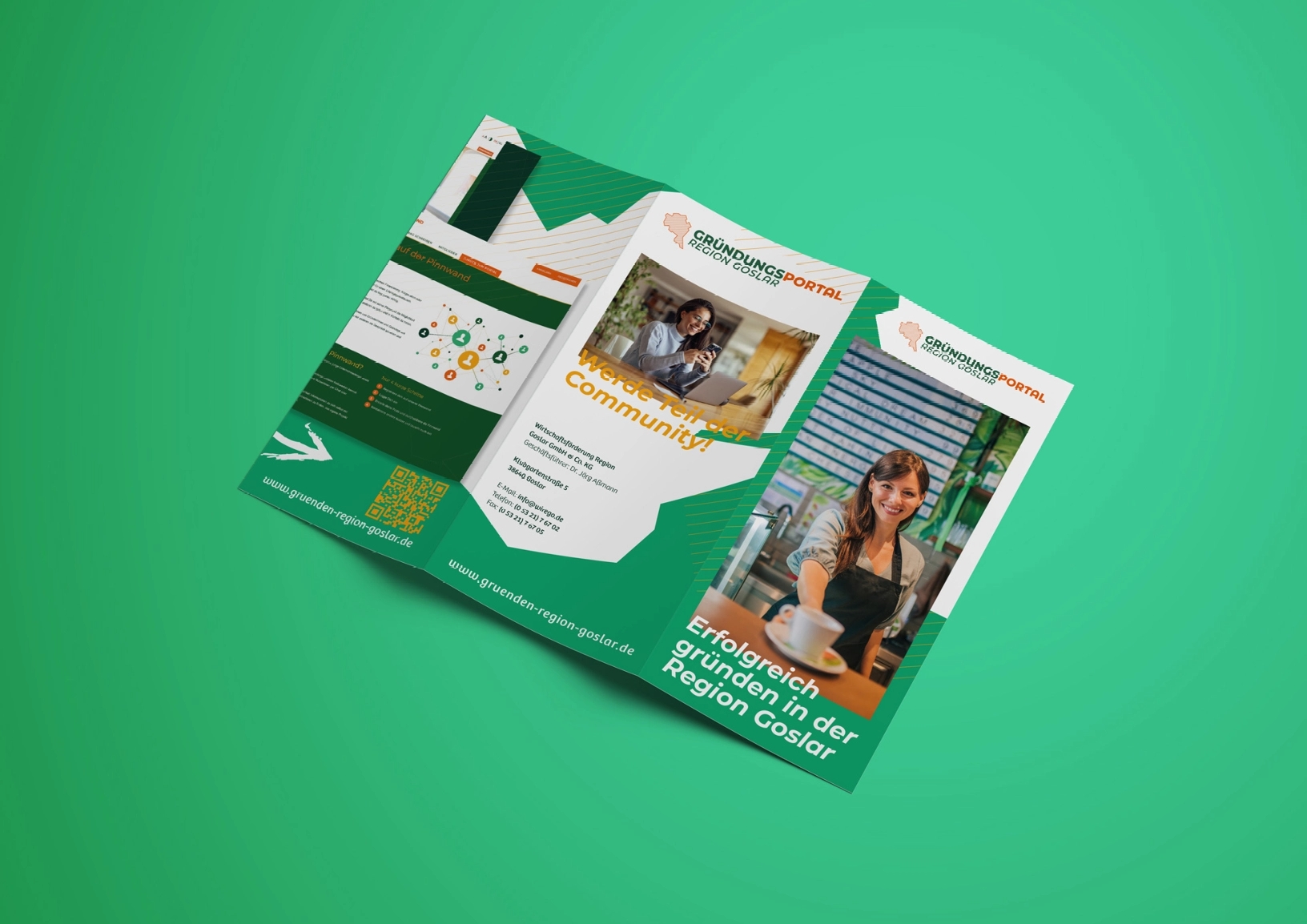 Um die Marke zu bewerben und eine gewisse Präsenz im Landkreis aufzubauen, wurden zwei verschiedene Plakate mit QR-Codes gestaltet. Neben Fotos sind auf den Printprodukten auch die Vorteile und der Nutzen des Gründungsportals und der Pinnwand vorgestellt. In den charakteristischen Farben des Corporate Designs ist auch der 6-seitige Flyer zu sehen, der GründerInnen und Interessierten näherbringt, wovon das Projekt handelt und worum es dabei geht, anschließend wurden die Werbemittel im Landkreis verteilt.