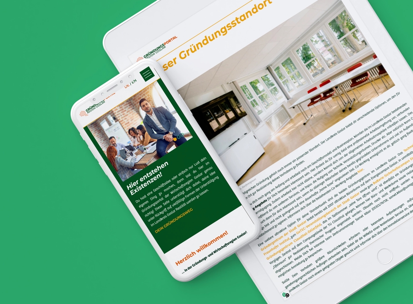 Die Website des Gründungsportals Region Goslar ist in mehrere Unterseiten unterteilt und dort finden GründerInnen aktuelle Events, Neuigkeiten und Workshops, auf denen sie sich informieren können. News und Eventbeiträge werden auf dieser Seite mit WiReGo synchronisiert. Zusätzlich finden sich dort Anlaufstellen und ein Beratungsnetzwerk, womit sie auf ihrem Gründungsweg begleitet werden. In den charakteristischen Grün- und Orangetönen gestaltet sich die Website modern und informativ.
