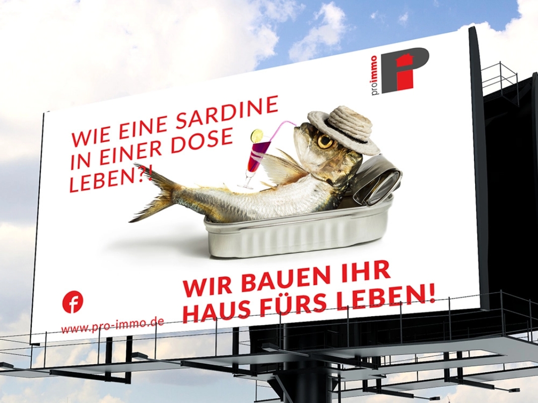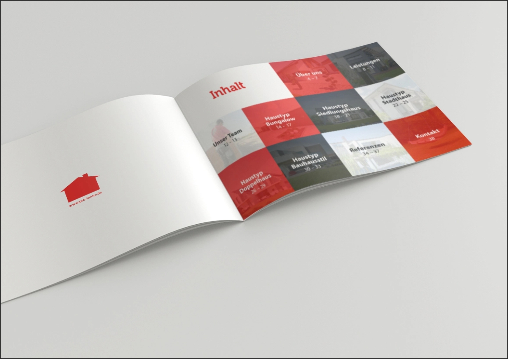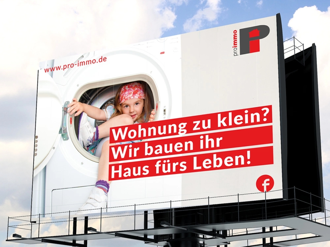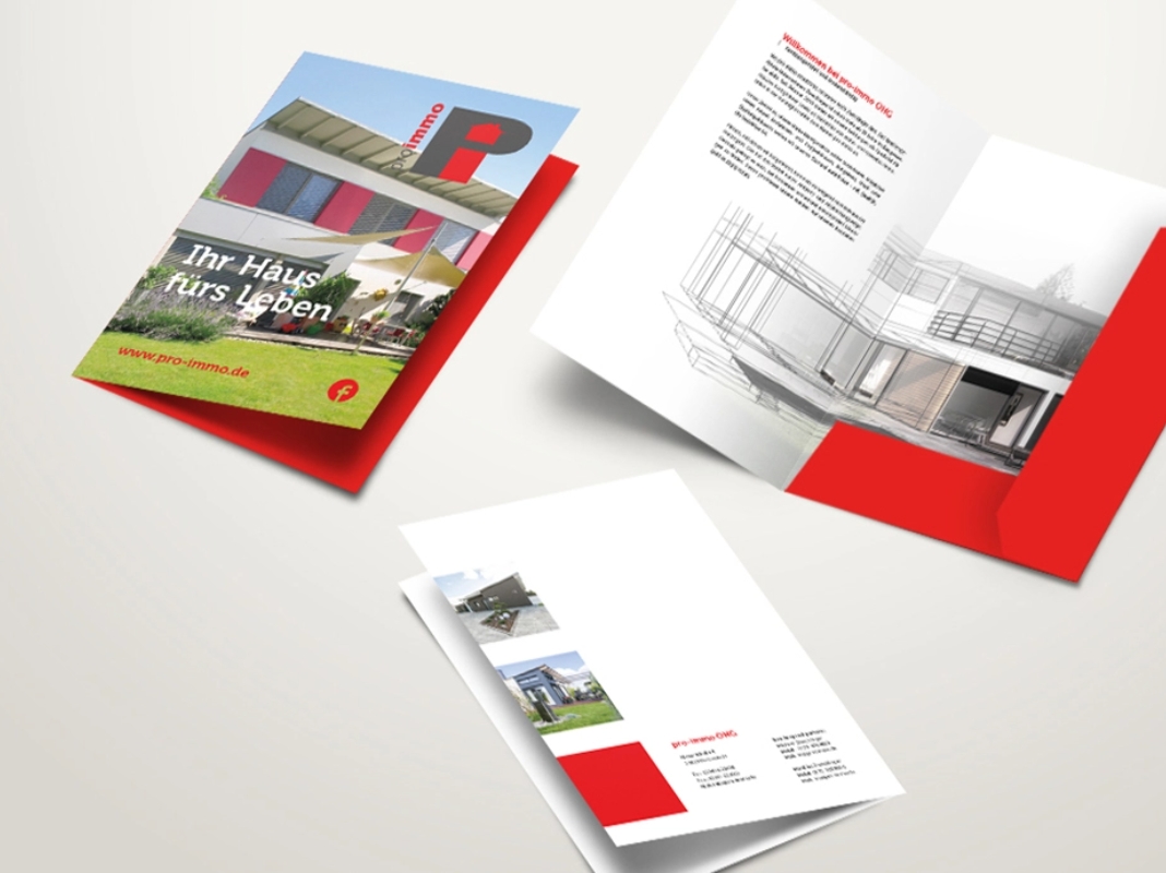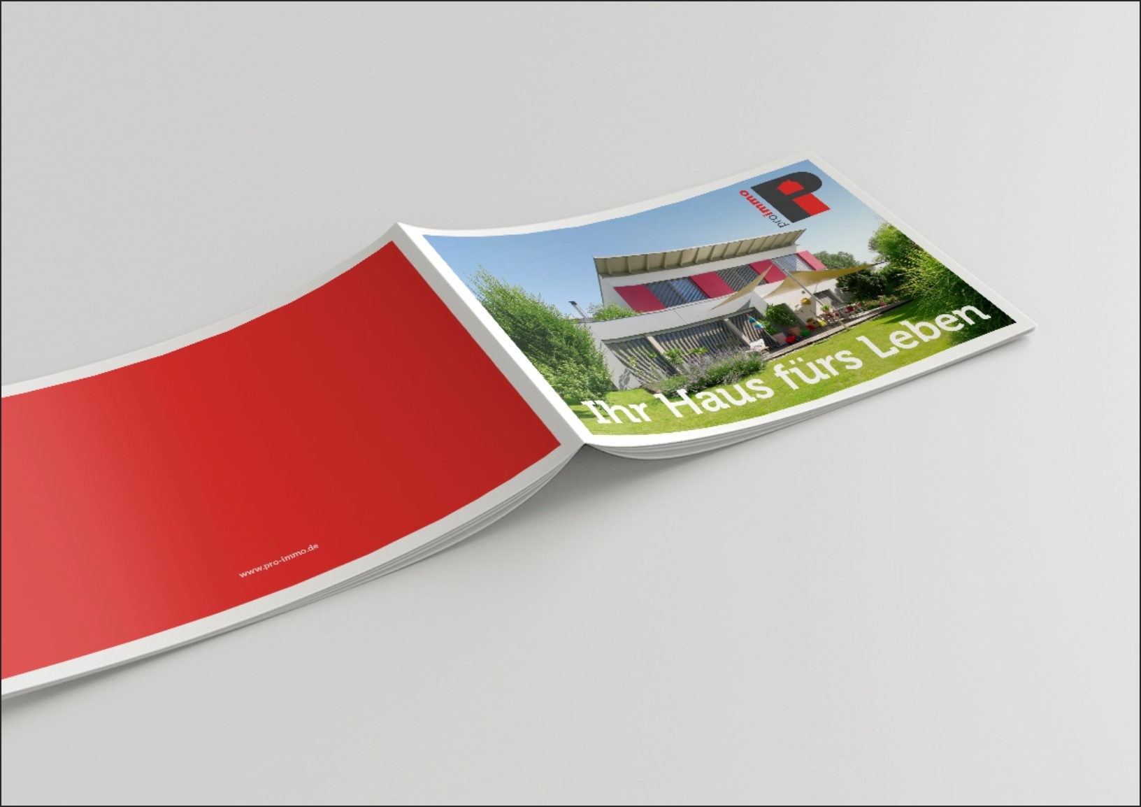 Plakate müssen nicht langweilig sein. Mit extravaganten Bildmotiven und ausgefallenen Slogans macht pro-immo auf sich aufmerksam, besonders zu erkennen auch an auffälliger Fensterbeklebung. Aber auch im kleineren Format einer Broschüre kann man sich einen schnellen und umfangreichen Überblick verschaffen. In der Broschüre können sich potenzielle Kunden über die Firma, die Leistungen, das Team oder die verschiedenen Haustypen informieren. Immobilienmarketing sollte immer an die Bedürfnisse der Zielgruppe angepasst sein und die Besonderheiten des jeweiligen Immobilienunternehmens in den Fokus rücken- bei pro-immo konnten wir dies erfolgreich umsetzen.