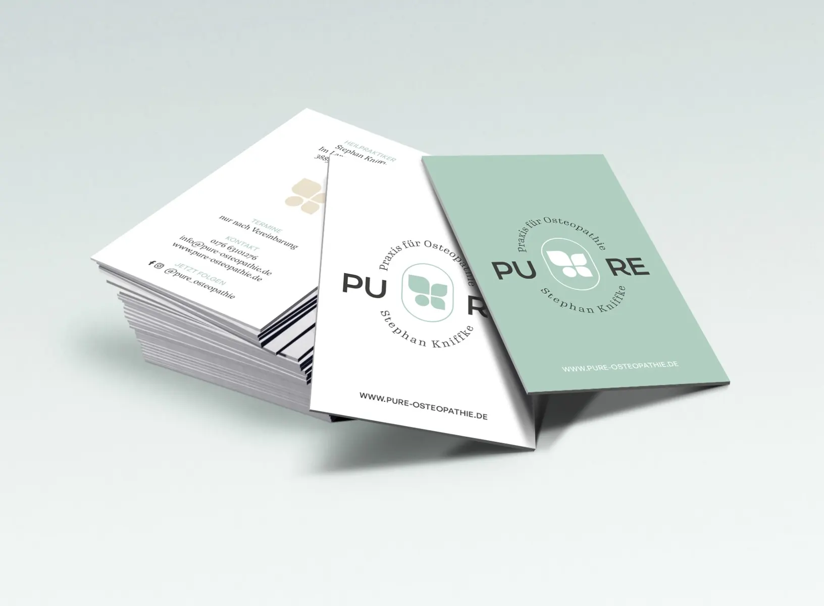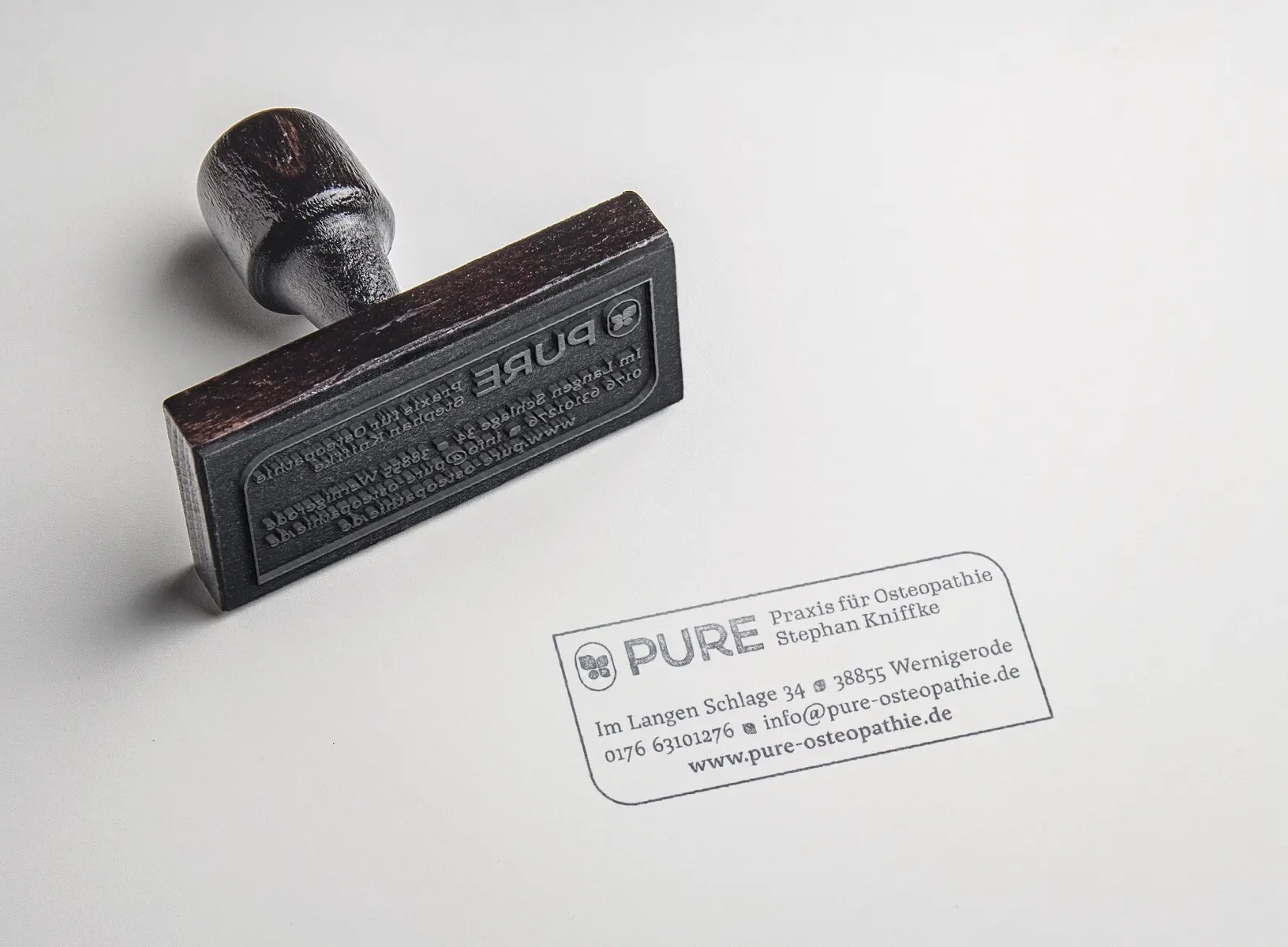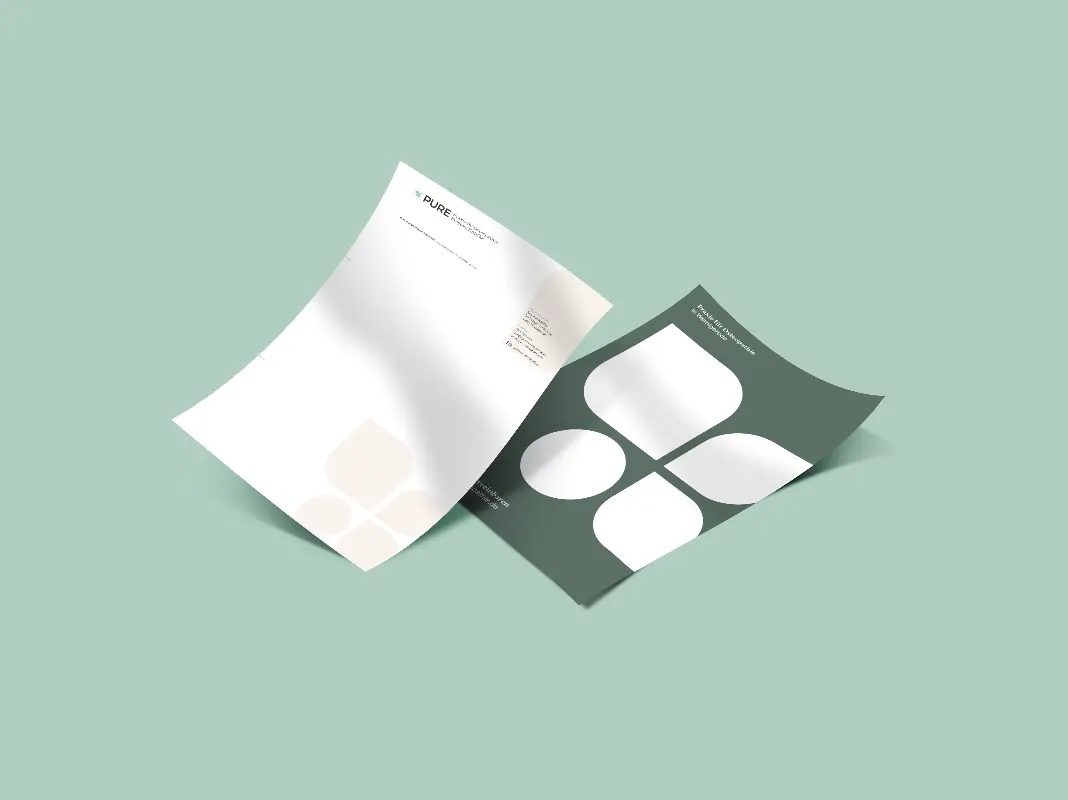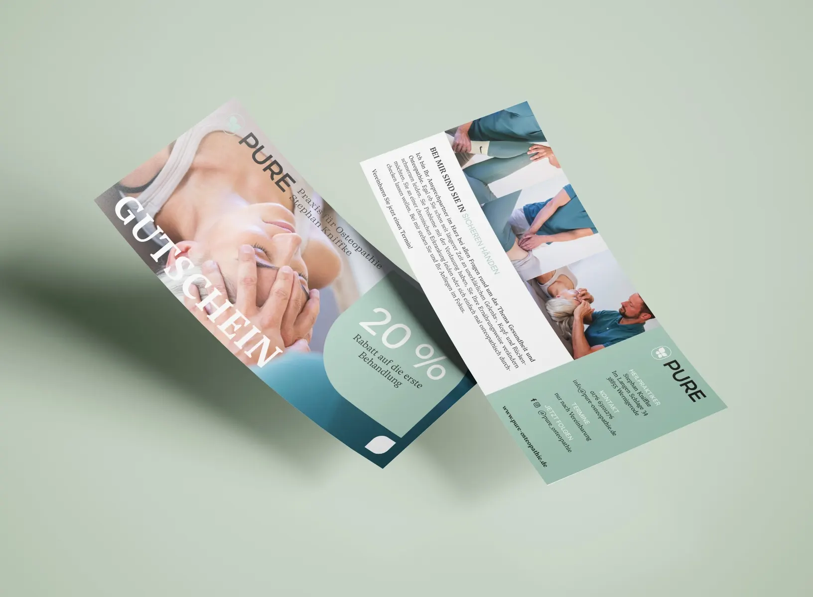 Vom klassischen Briefpapier, über individuell gestaltete Visitenkarten bis hin zu einem maßgeschneiderten Stempel und Firmenschild - jedes Element wurde mit Liebe zum Detail gestaltet. Diese Ausstattung ermöglicht es PURE, sich in jeder geschäftlichen Korrespondenz und Begegnung professionell zu präsentieren. Wir haben auch Coupons kreiert, die nicht nur einladend wirken, sondern auch ein großartiges Marketinginstrument darstellen. Kunden können von attraktiven Angeboten profitieren und gleichzeitig die Marke PURE entdecken.