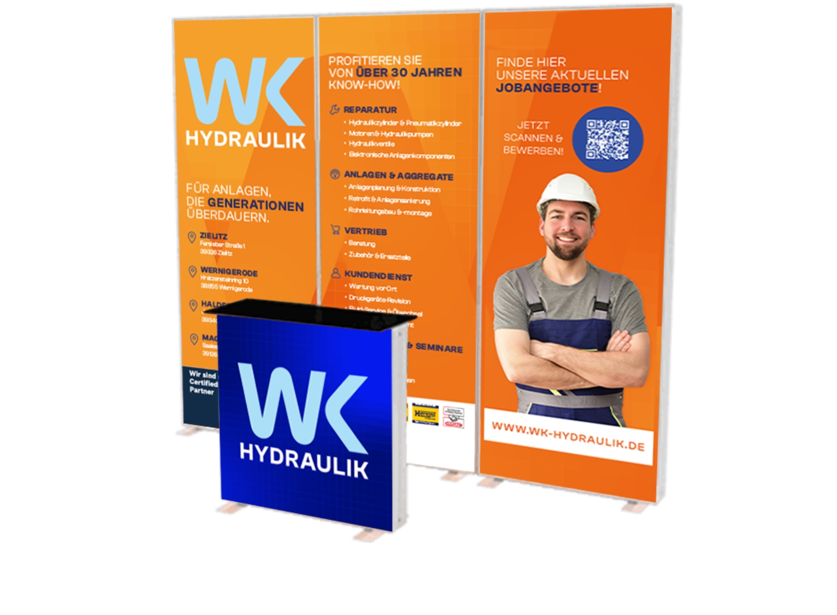Zusätzlich haben wir WK Hydraulik mit einer komplett neuen Messeausstattung versehen, die nicht nur visuell beeindruckt, sondern auch strategisch durchdacht ist. Der neu entworfene Messestand, gestaltet in den auffälligen Farben von WK Hydraulik, zieht die Aufmerksamkeit auf sich und schafft einen unvergesslichen ersten Eindruck. Die Dropflags verstärken die Sichtbarkeit und lenken gezielt Besucherströme zum Stand.