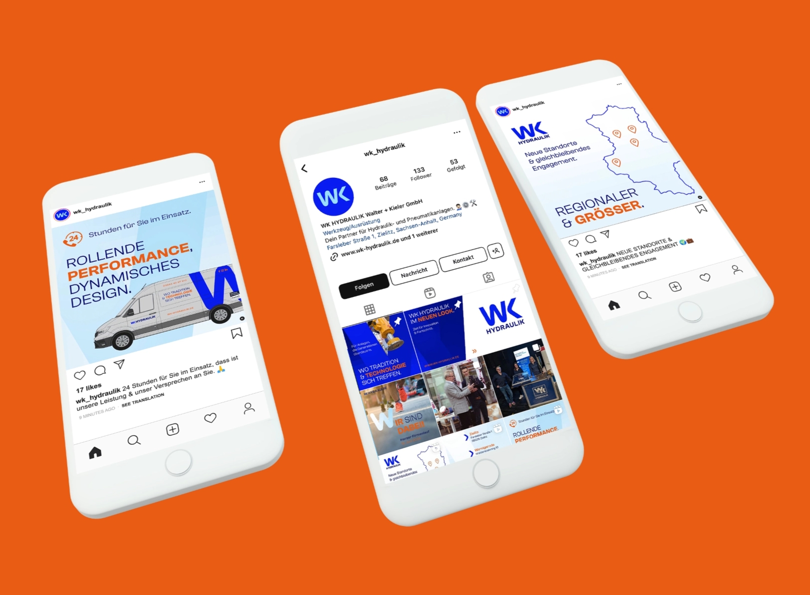 Im Rahmen des umfassenden Relaunchs haben wir auch die Gestaltung der Social Media Auftritte von WK Hydraulik vereinheitlicht und modernisiert. Durch die professionelle und strategisch durchdachte Social Media Präsenz präsentiert sich das Unternehmen wirkungsvoll nach außen. Die regelmäßige und kreative Nutzung von Social Media trägt dazu bei, die Markenbekanntheit zu erhöhen und die Position von WK Hydraulik als attraktiver Arbeitgeber zu unterstreichen.